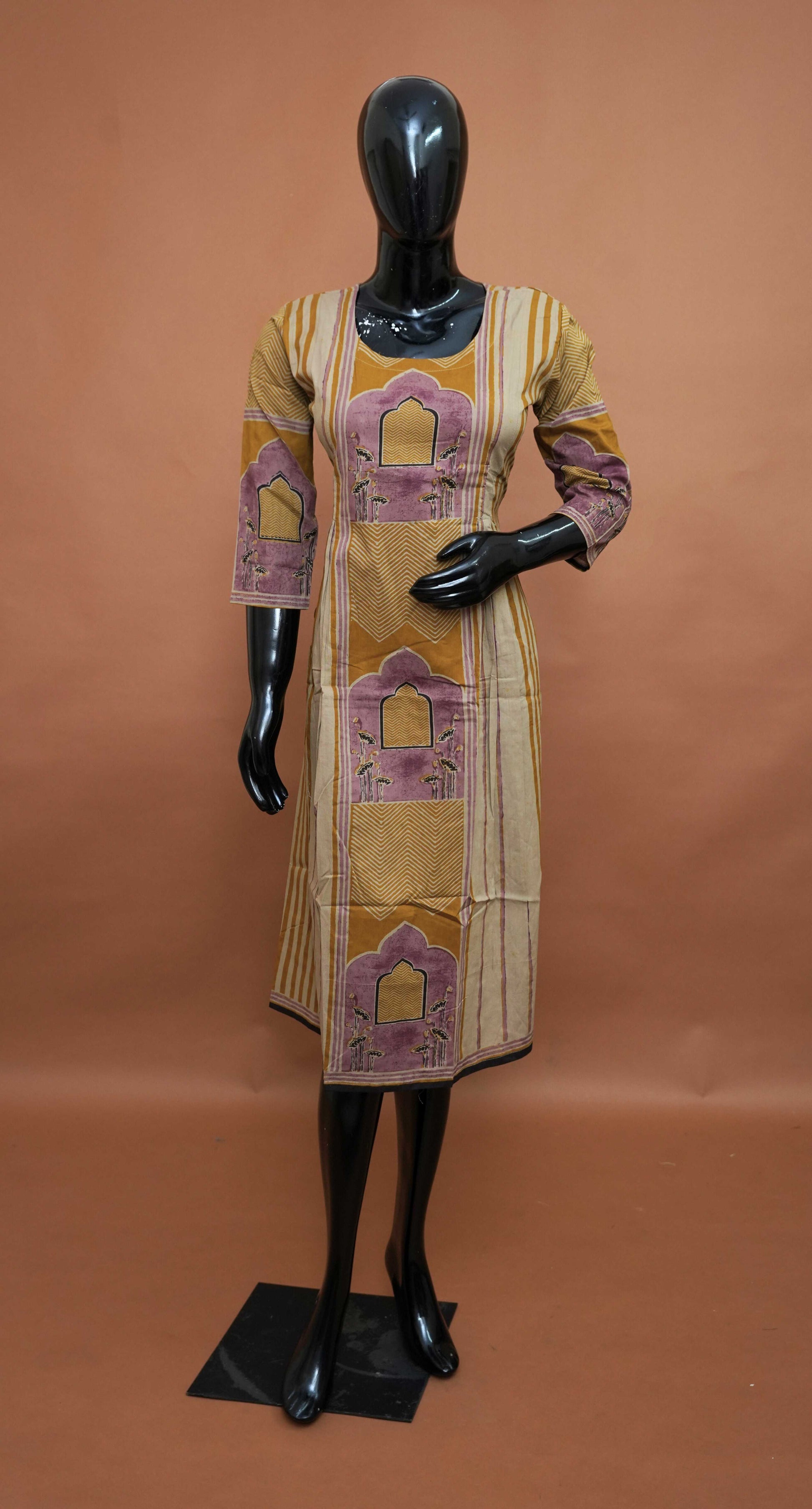 The frock-style silhouette adds a graceful flow, making it both comfortable and flattering. The Yellow Colour base enhances the intricate print detailing, creating a bold yet elegant look. Perfect for casual ethnic styling, office wear, or relaxed festive gatherings.
